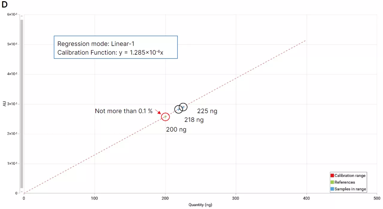 5-point calibration curve of DEG/EG (D) (from left to right, 50 ng, 75 ng, 100 ng, 150 ng, 200 ng, red circles) generated from peak profiles from scanning densitometry (PPSD) at 520 nm.